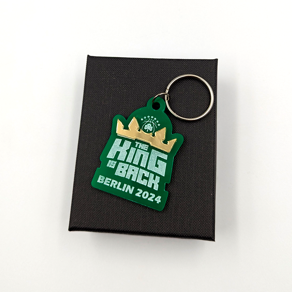 Είναι ένα ειδικά σχεδιασμένο αξεσουάρ για τους φίλους της ομάδας. Κατασκευασμένο από πράσινο ακρυλικό, το μπρελόκ παρουσιάζει το λογότυπο του Παναθηναϊκού με το σλόγκαν ” The King is Back Berlin 2024 “και η κορώνα αποτελείται από χρυσό ακρυλικό καθρέπτη. Ένα σύμβολο για την επιτυχία και την περηφάνια των φιλάθλων του Παναθηναϊκού για το κύπελο Euroleague 2024.
