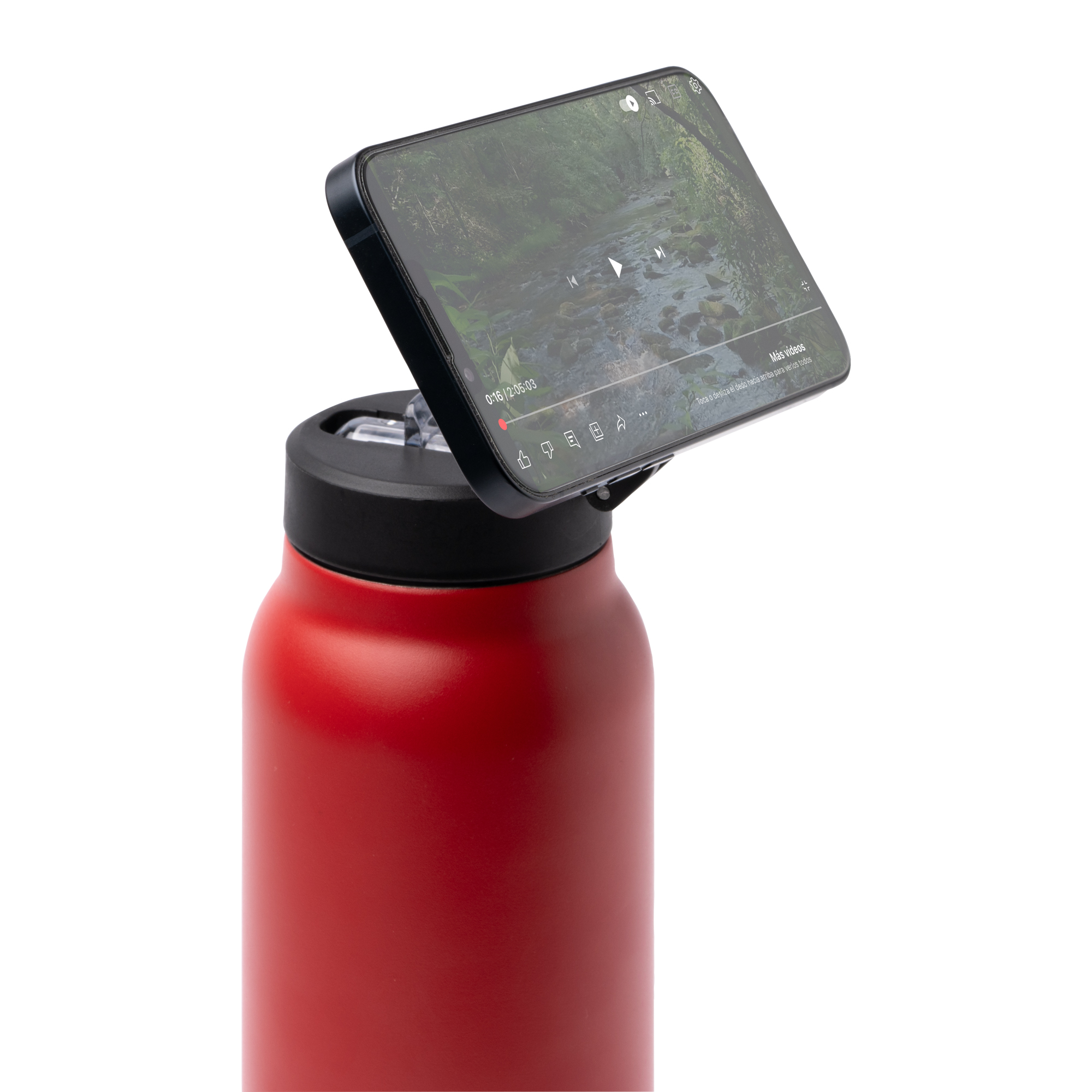 Με χωρητικότητα 750 ml, διαθέτει πρακτικό καπάκι με μαγνητικό δακτύλιο που λειτουργεί και ως θήκη κινητού τηλεφώνου, πτυσσόμενο καλαμάκι για εύκολη χρήση και αντιολισθητικό λάστιχο στη βάση για σταθερότητα. Η συσκευασία σε οικολογικό κουτί με ξεχωριστό σχεδιασμό αναδεικνύει την περιβαλλοντική ευαισθησία της εταιρείας σας, καθιστώντας το μπουκάλι ένα κομψό, πρωτότυπο και φιλικό προς το περιβάλλον εταιρικό δώρο.