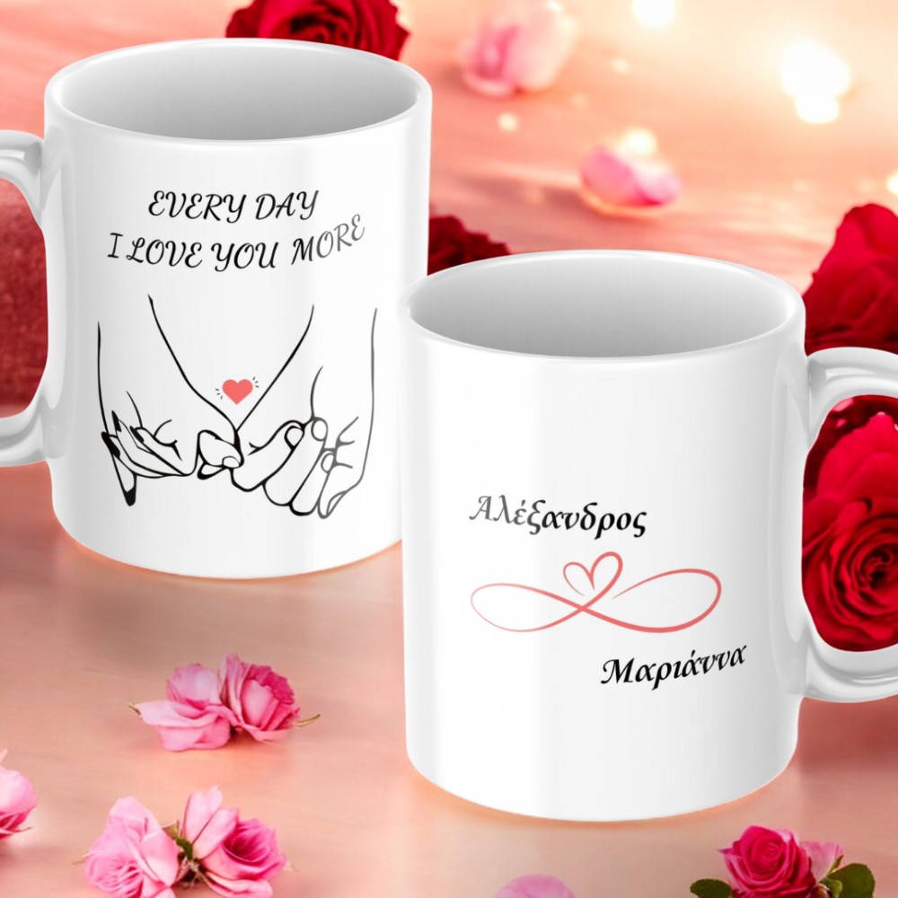 - Φόντο Χέρια: Στην μπροστινή πλευρά της κούπας, δύο χέρια που ενώνονται , δημιουργώντας μία ισχυρή εικόνα της σύνδεσης του ζευγαριού. Από πάνω, η φράση “Every day I love you more” ενισχύει την αίσθηση της συνεχούς ανάπτυξης της αγάπης σας. Στην άλλη πλευρά της κούπας, τα ονόματα του ζευγαριού εμφανίζονται κάτω από το σύμβολο του απείρου με καρδιά, που σηματοδοτεί την ατελείωτη αγάπη και την αδιάκοπη σύνδεση μεταξύ σας.