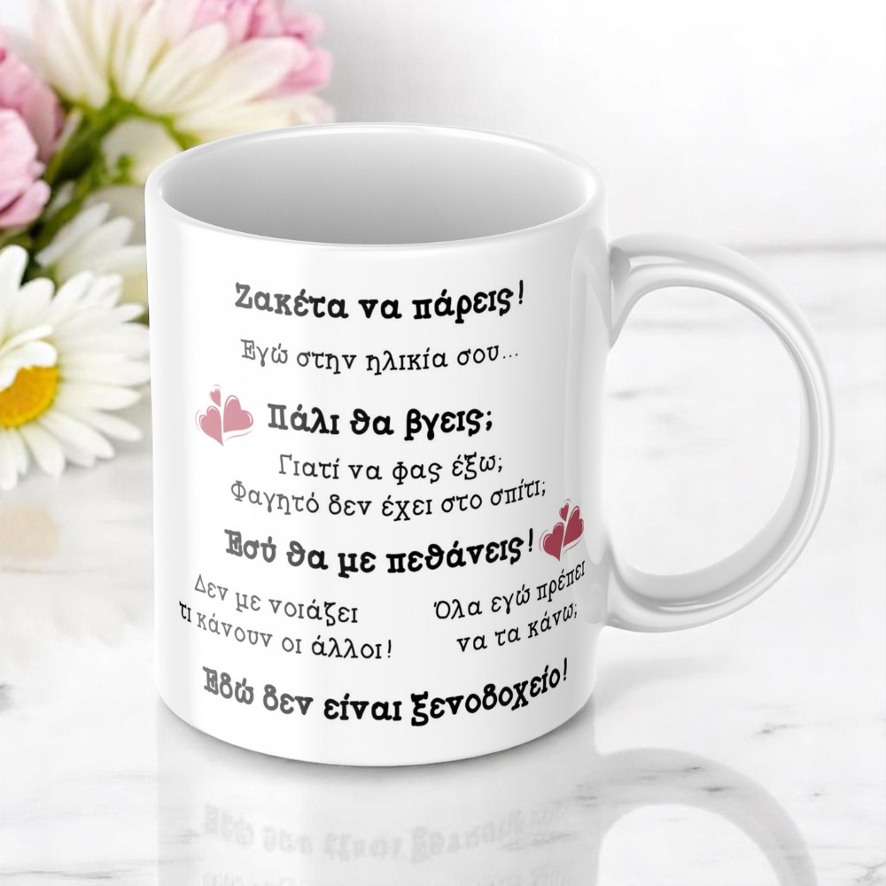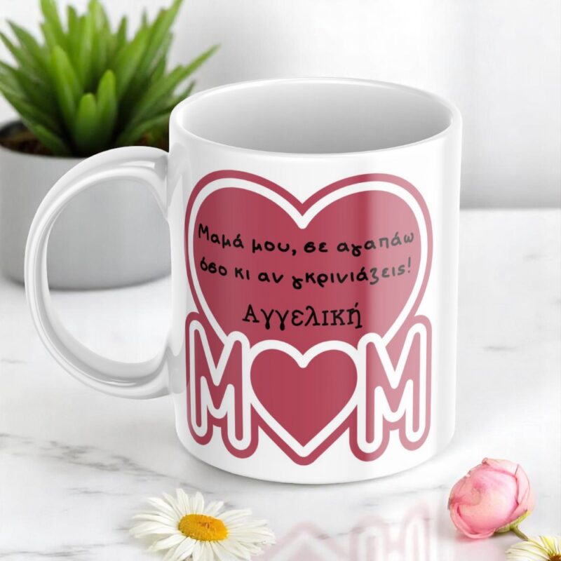 Η λέξη “MOM” δεσπόζει μέσα σε μια καρδιά, πλαισιωμένη από λουλούδια και το όνομα της μητέρας. Δεξιά, κλασικές και αγαπημένες φράσεις της Ελληνίδας μαμάς χαρίζουν χιούμορ και νοσταλγία που θα την κάνουν να χαμογελάσει κάθε φορά που πίνει τον καφέ της.