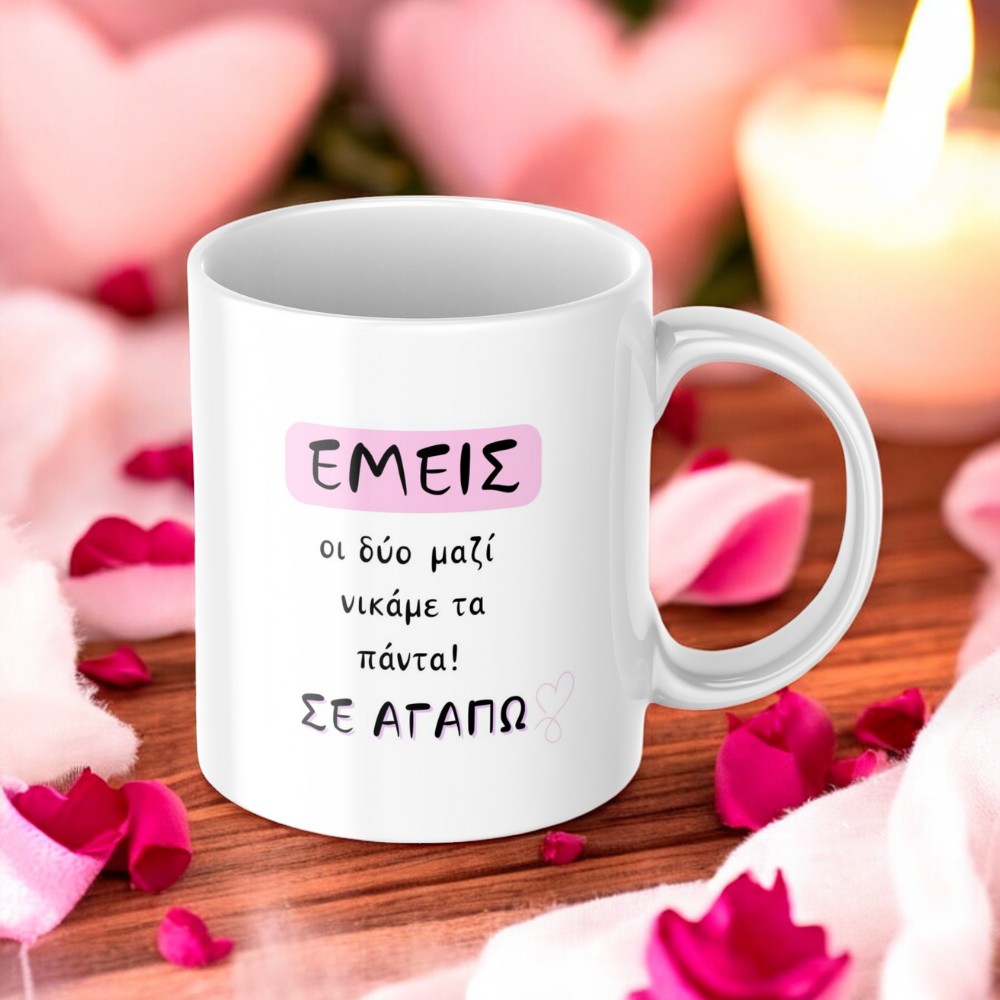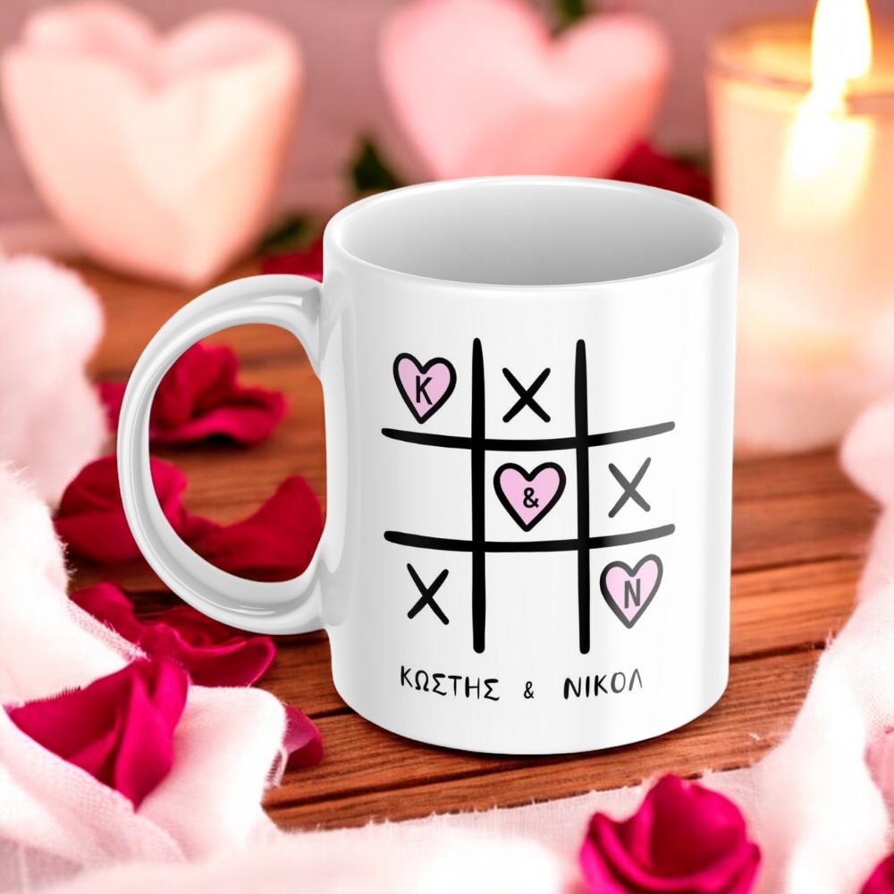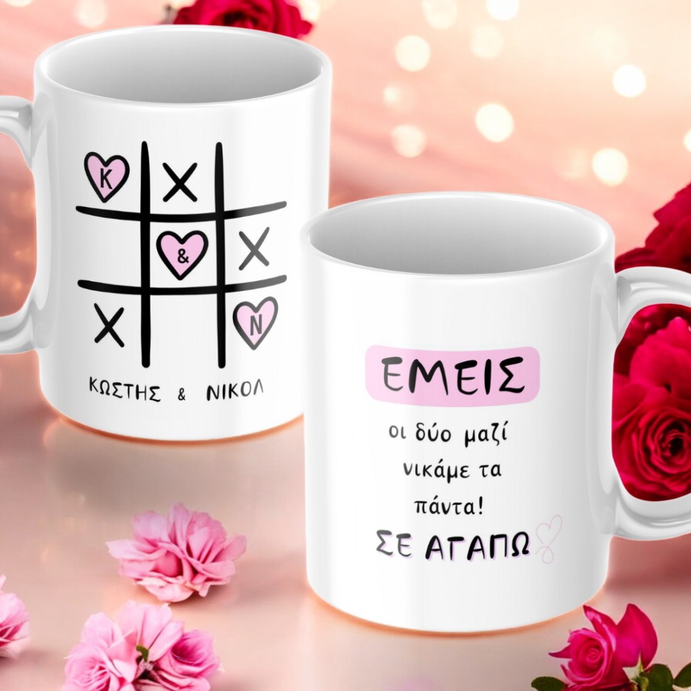 Εκφράστε την αγάπη σας με μια ξεχωριστή προσωποποιημένη κούπα! Διαθέτει μοναδική σχεδίαση μια τρίλιζα με τρεις ενωμένες καρδιές, στις οποίες μπορείτε να προσθέσετε τα δικά σας αρχικά και τα ονόματά σας. Στην άλλη πλευρά, η ρομαντική φράση “Εμείς οι δύο νικάμε τα πάντα. Μαζί. Σ’ αγαπώ.” κάνει αυτή την κούπα πραγματικά ξεχωριστή. Ιδανική για την ημέρα του Αγίου Βαλεντίνου, επετείους ή κάθε στιγμή που θέλετε να δείξετε την αγάπη σας. Χαρίστε ένα δώρο που συνδυάζει συναίσθημα και πρακτικότητα!