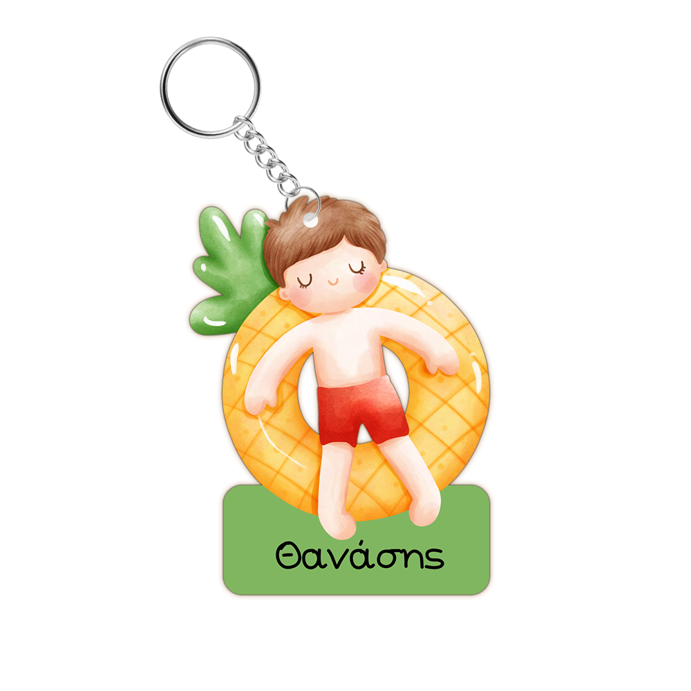 Το μπρελόκ απεικονίζει ένα χαρούμενο αγοράκι με μαγιό, ξαπλωμένο πάνω σε ένα σωσίβιο σε σχήμα ανανά, απολαμβάνοντας στιγμές χαλάρωσης. Τα ζωντανά χρώματα και η διασκεδαστική εικόνα του σχεδίου κάνουν το μπρελόκ ένα χαρούμενο αξεσουάρ που τα παιδιά θα λατρέψουν να έχουν μαζί τους καθημερινά.