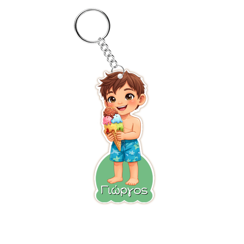 Το μπρελόκ απεικονίζει ένα χαρούμενο αγοράκι με μαγιό, τρώγοντας ένα παγωτό. Τα ζωντανά χρώματα και η διασκεδαστική εικόνα του σχεδίου κάνουν το μπρελόκ ένα χαρούμενο αξεσουάρ που τα παιδιά θα λατρέψουν να έχουν μαζί τους καθημερινά.