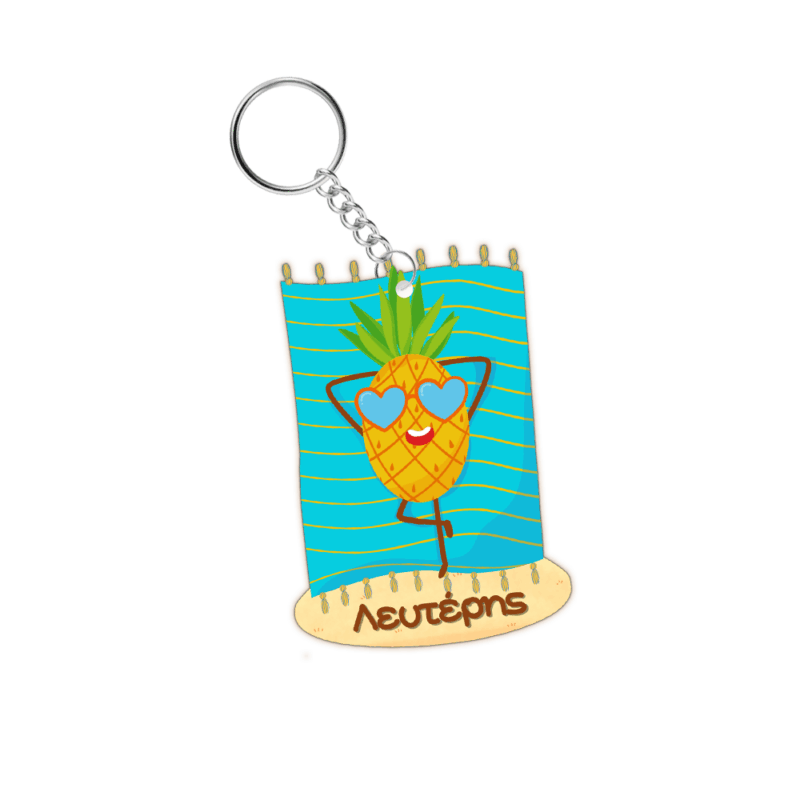 Το μπρελόκ απεικονίζει μια γαλάζια πετσέτα θαλάσσης με κίτρινες λεπτομέρειες, η οποία ακουμπάει στην άμμο. Πάνω στην πετσέτα είναι ξαπλωμένος ανέμελα ένας καρτούν ανανάς με γυαλιά ηλίου, προσφέροντας μια εικόνα γεμάτη καλοκαιρινή χαρά. Τα ζωντανά χρώματα και η διασκεδαστική εικόνα του σχεδίου κάνουν το μπρελόκ ένα χαρούμενο αξεσουάρ που τα παιδιά θα λατρέψουν να έχουν μαζί τους καθημερινά.