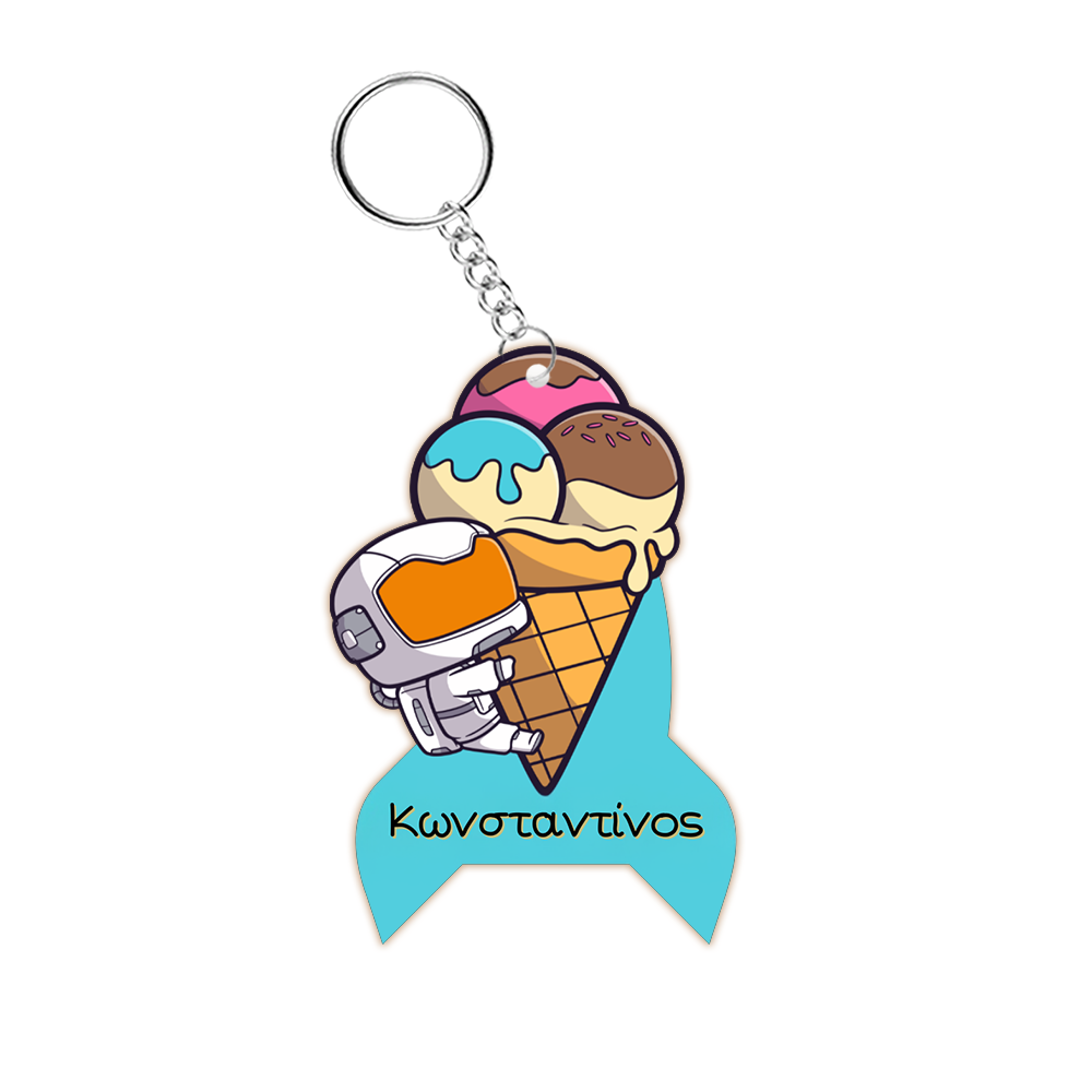 Το μπρελόκ απεικονίζει ένα εντυπωσιακό διαστημόπλοιο σε γαλάζιο χρώμα, το οποίο καλύπτεται στο πάνω μέρος από ένα χωνάκι παγωτού με τρεις μπάλες παγωτού. Στα αριστερά από το χωνάκι, κρατιέται ένας αστροναύτης, έτοιμος να ταξιδέψει στο διάστημα. Τα ζωντανά χρώματα και η διασκεδαστική εικόνα του σχεδίου κάνουν το μπρελόκ ένα χαρούμενο αξεσουάρ που τα παιδιά θα λατρέψουν να έχουν μαζί τους καθημερινά.