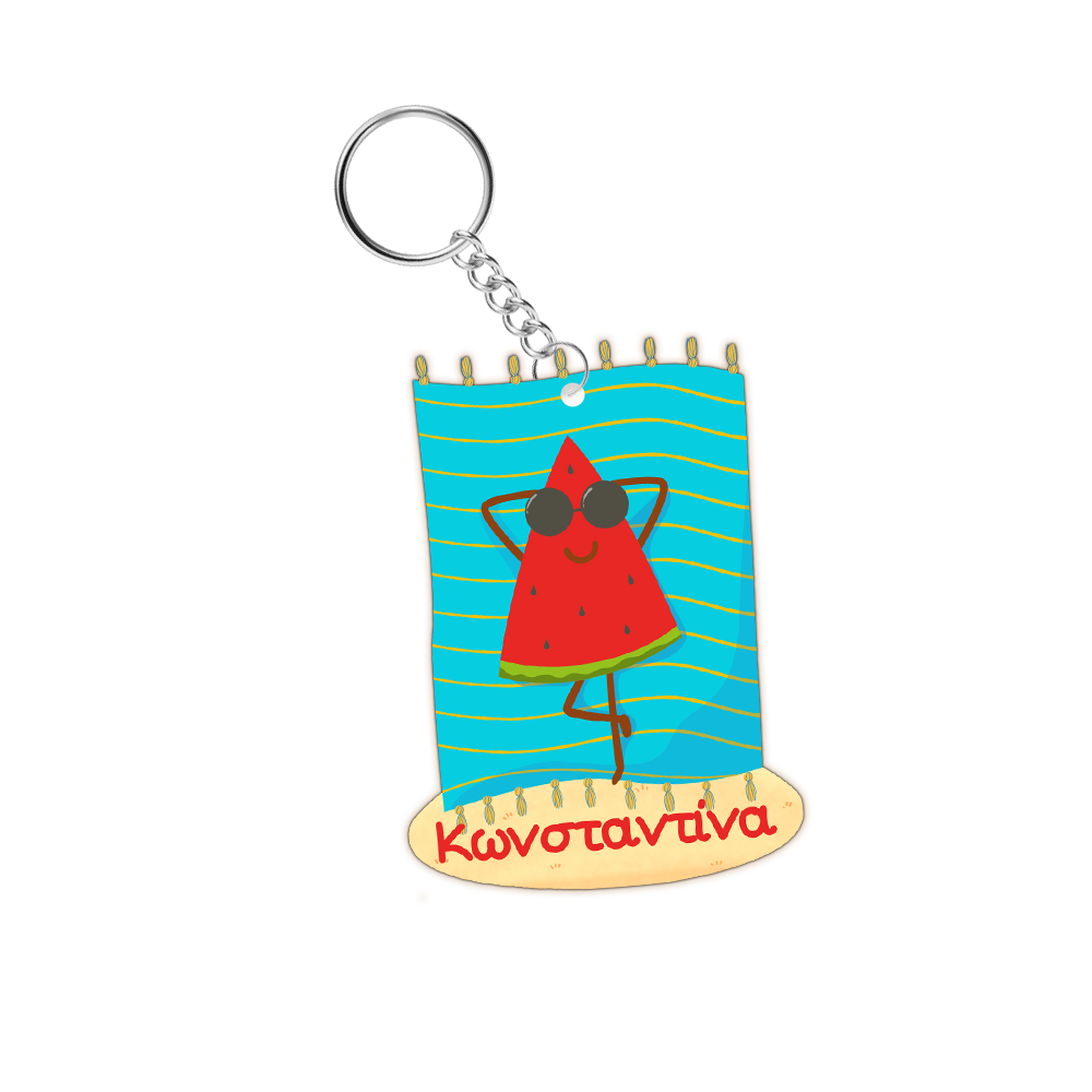 Το μπρελόκ απεικονίζει μια γαλάζια πετσέτα θαλάσσης με κίτρινες λεπτομέρειες, η οποία ακουμπάει στην άμμο. Πάνω στην πετσέτα είναι ξαπλωμένο ανέμελα ένα καρτούν καρπούζι με γυαλιά ηλίου, προσφέροντας μια εικόνα γεμάτη καλοκαιρινή χαρά. Τα ζωντανά χρώματα και η διασκεδαστική εικόνα του σχεδίου κάνουν το μπρελόκ ένα χαρούμενο αξεσουάρ που τα παιδιά θα λατρέψουν να έχουν μαζί τους καθημερινά.