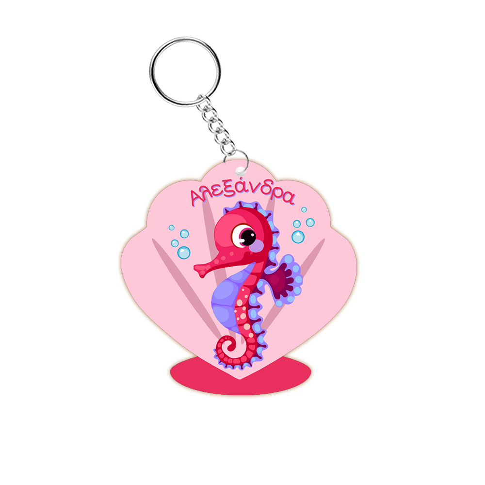 Το μπρελόκ απεικονίζει ένα χαριτωμένο ροζ κοχύλι με φούξια βάση, ενώ στο κέντρο του βρίσκεται ένας υπέροχος ιππόκαμπος σε φούξια και μωβ αποχρώσεις, που συνοδεύεται από μικρές μπουρμπουλήθρες. Τα ζωντανά χρώματα και η διασκεδαστική εικόνα του σχεδίου κάνουν το μπρελόκ ένα χαρούμενο αξεσουάρ που τα παιδιά θα λατρέψουν να έχουν μαζί τους καθημερινά.