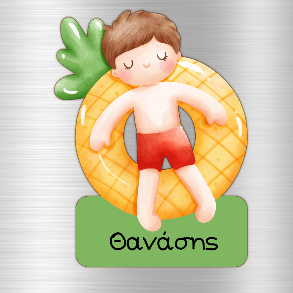 Το μαγνητάκι απεικονίζει ένα χαρούμενο αγοράκι με μαγιό, ξαπλωμένο πάνω σε ένα σωσίβιο σε σχήμα ανανά, απολαμβάνοντας στιγμές χαλάρωσης. Τα ζωντανά χρώματα και η προσεγμένη λεπτομέρεια το καθιστούν ένα ξεχωριστό διακοσμητικό για το ψυγείο ή οποιαδήποτε μεταλλική επιφάνεια.
