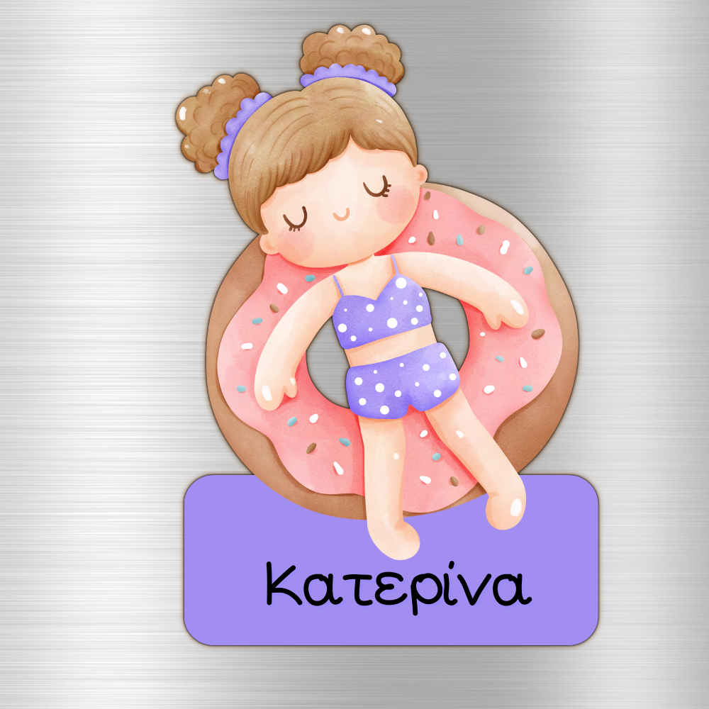 Το μαγνητάκι απεικονίζει ένα χαρούμενο κοριτσάκι με μαγιό, ξαπλωμένο πάνω σε ένα σωσίβιο σε σχήμα ντόνατ, απολαμβάνοντας στιγμές χαλάρωσης. Τα ζωντανά χρώματα και η προσεγμένη λεπτομέρεια το καθιστούν ένα ξεχωριστό διακοσμητικό για το ψυγείο ή οποιαδήποτε μεταλλική επιφάνεια.