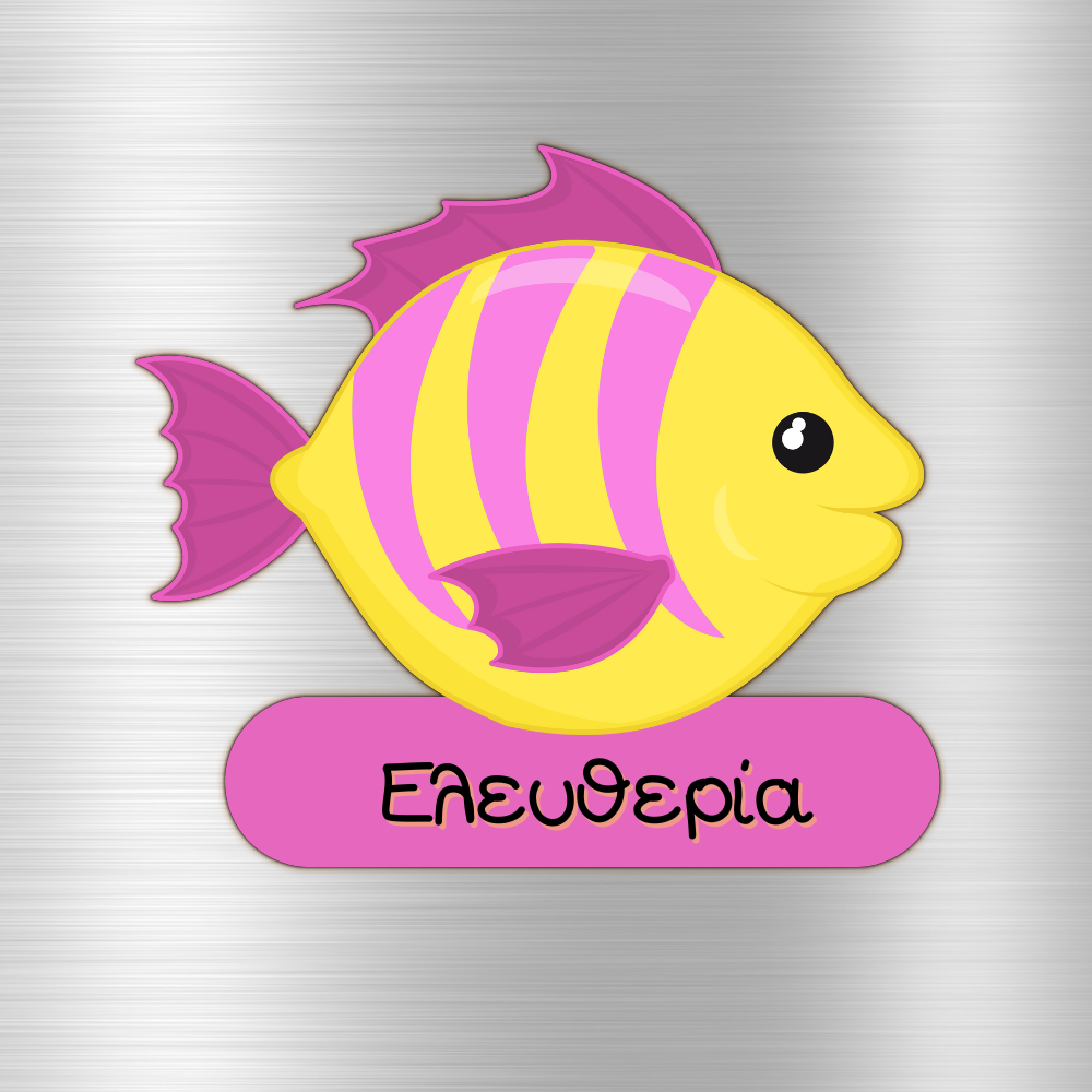 Το μαγνητάκι απεικονίζει ένα χαρούμενο, καρτουνίστικο ψαράκι σε αποχρώσεις του κίτρινου με φούξια λεπτομέρειες, που στέκεται παιχνιδιάρικα πάνω σε ένα φούξια πλαίσιο. Το σχέδιο αποπνέει δροσιά και καλοκαιρινή ανεμελιά, ενώ τα φωτεινά του χρώματα το κάνουν να ξεχωρίζει ως διακοσμητικό για το ψυγείο ή οποιαδήποτε μεταλλική επιφάνεια.