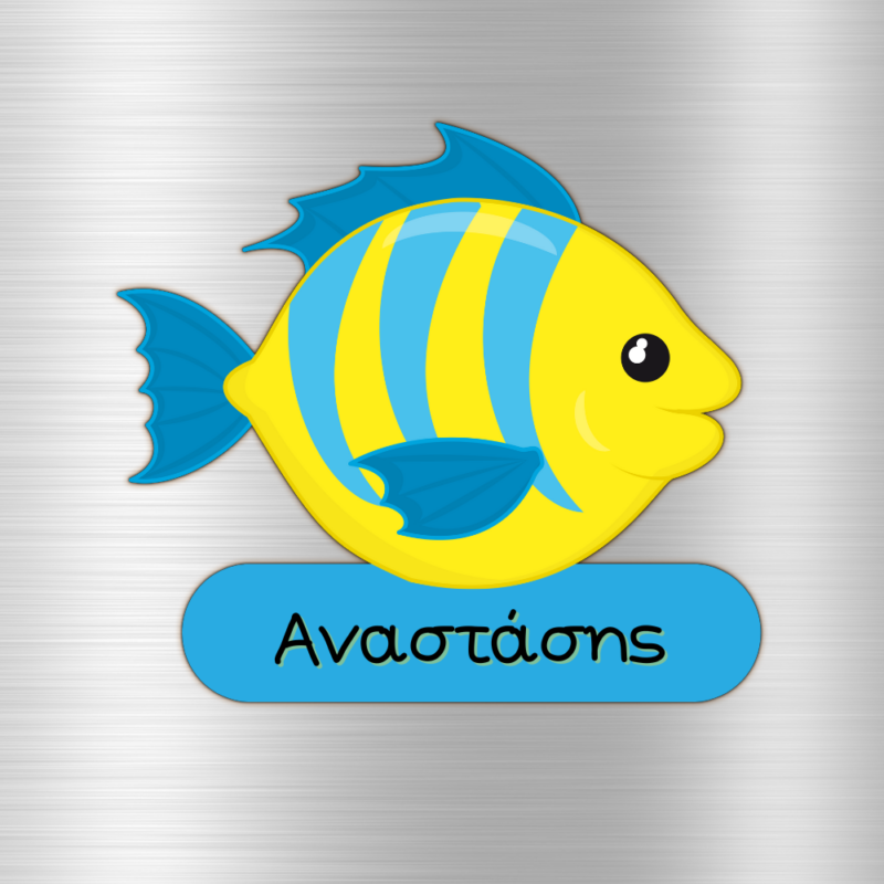 Το μαγνητάκι απεικονίζει ένα χαρούμενο, καρτουνίστικο ψαράκι σε αποχρώσεις του κίτρινου με γαλάζιες λεπτομέρειες, που στέκεται παιχνιδιάρικα πάνω σε ένα γαλάζιο πλαίσιο. Το σχέδιο αποπνέει δροσιά και καλοκαιρινή ανεμελιά, ενώ τα φωτεινά του χρώματα το κάνουν να ξεχωρίζει ως διακοσμητικό για το ψυγείο ή οποιαδήποτε μεταλλική επιφάνεια.